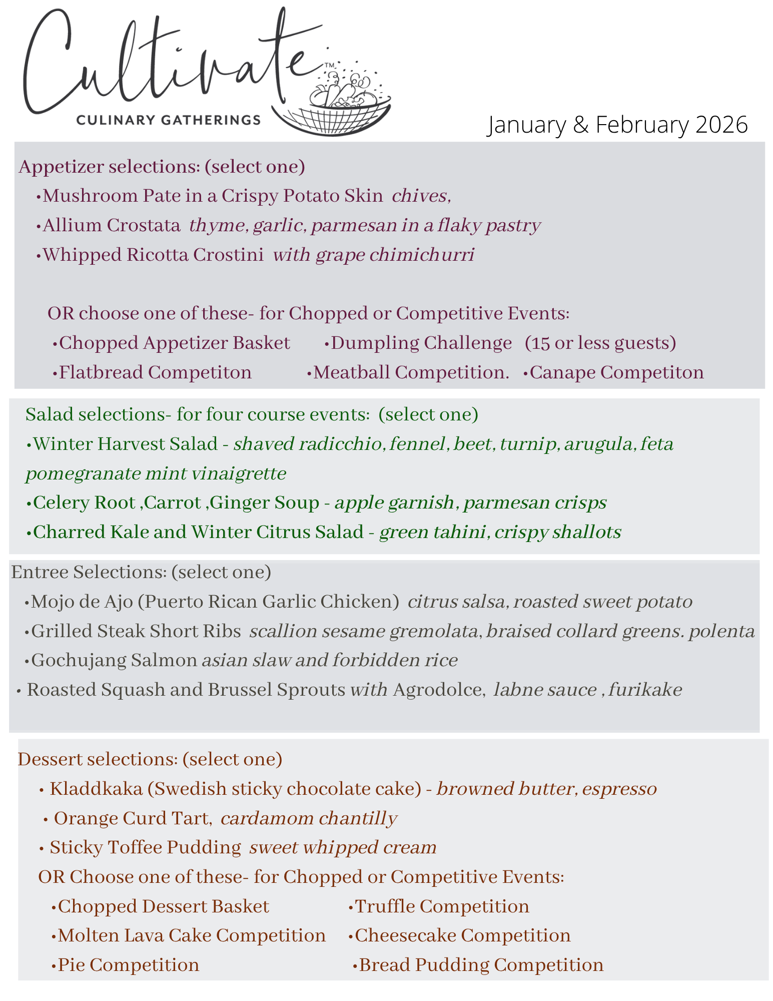 Chopped Format- You choose either an appetizer or dessert chopped basket, teams open the basket and have a set amount of time to take those ingredients and create an appetizer or dessert (we will have decided which ahead of time). Teams have access to other ingredients to help differentiate their dish and make it more them…but all ingredients in the basket must be used. Our chefs judge and decide a winner (with great fanfare). Our chefs prepare the other 2 or 3 courses to make a full meal and the group enjoys all the courses seated at our table. Many groups order beverages a la cart and/or opt for wine pairing.